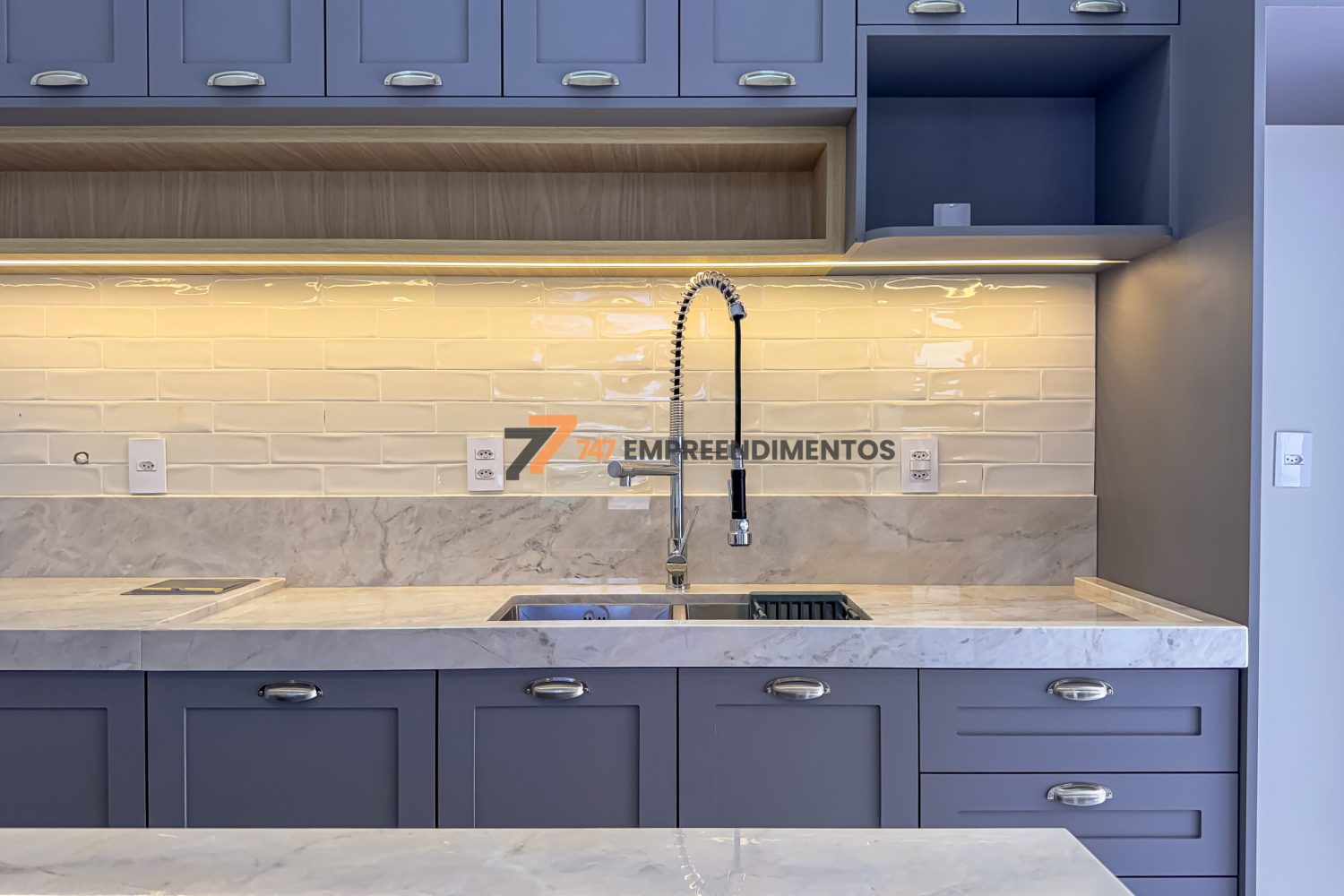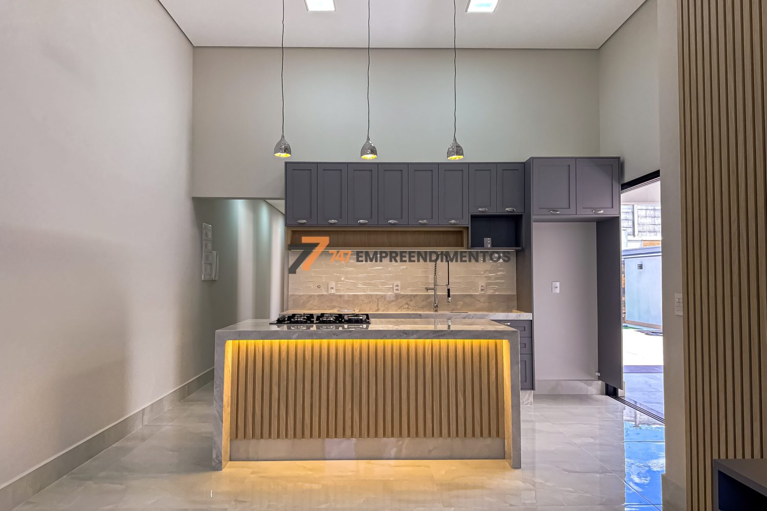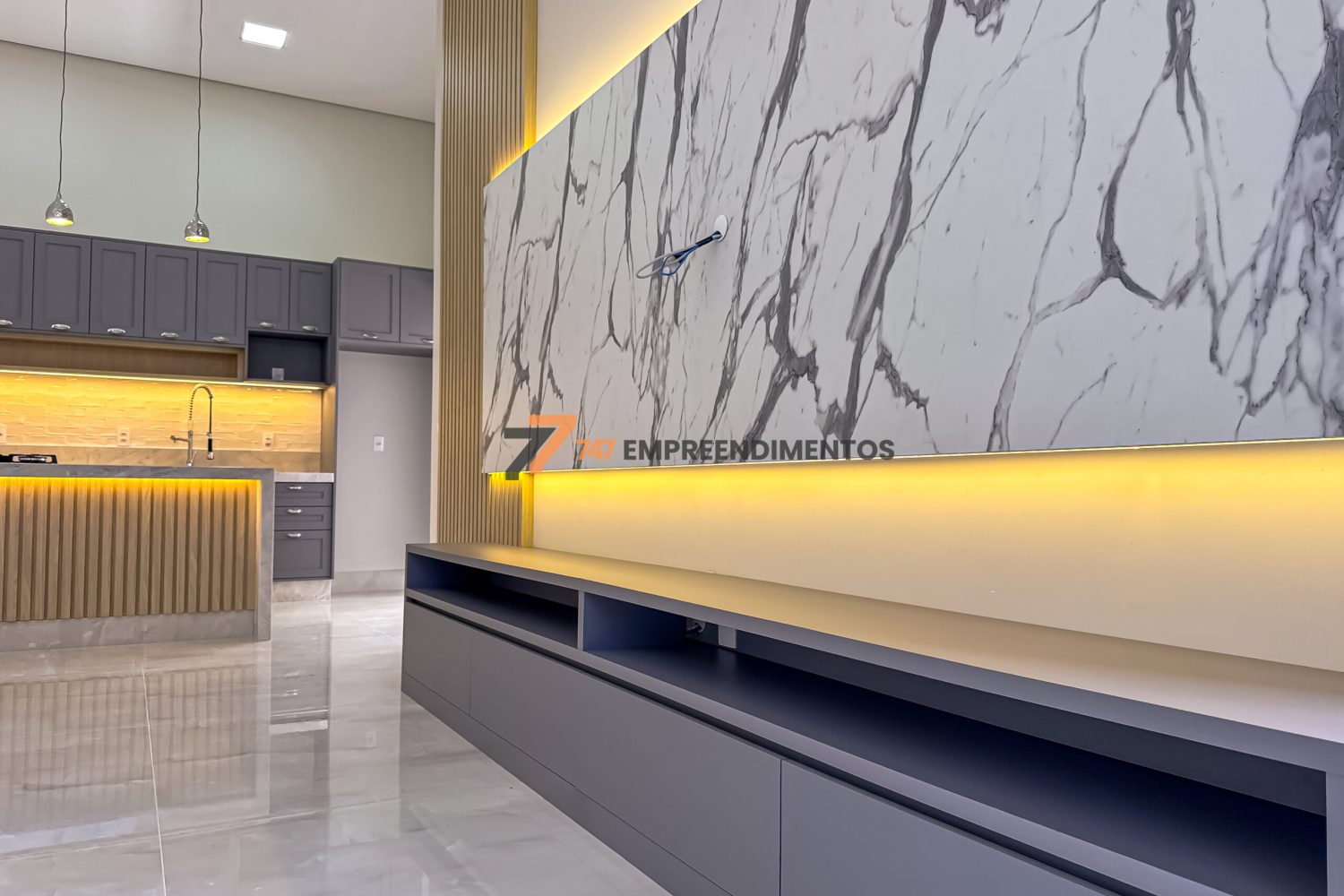 A sala com home e pé-direito alto proporciona amplitude e elegância, enquanto a cozinha com ilha central e planejados une design moderno e praticidade, criando um ambiente perfeito para receber.
