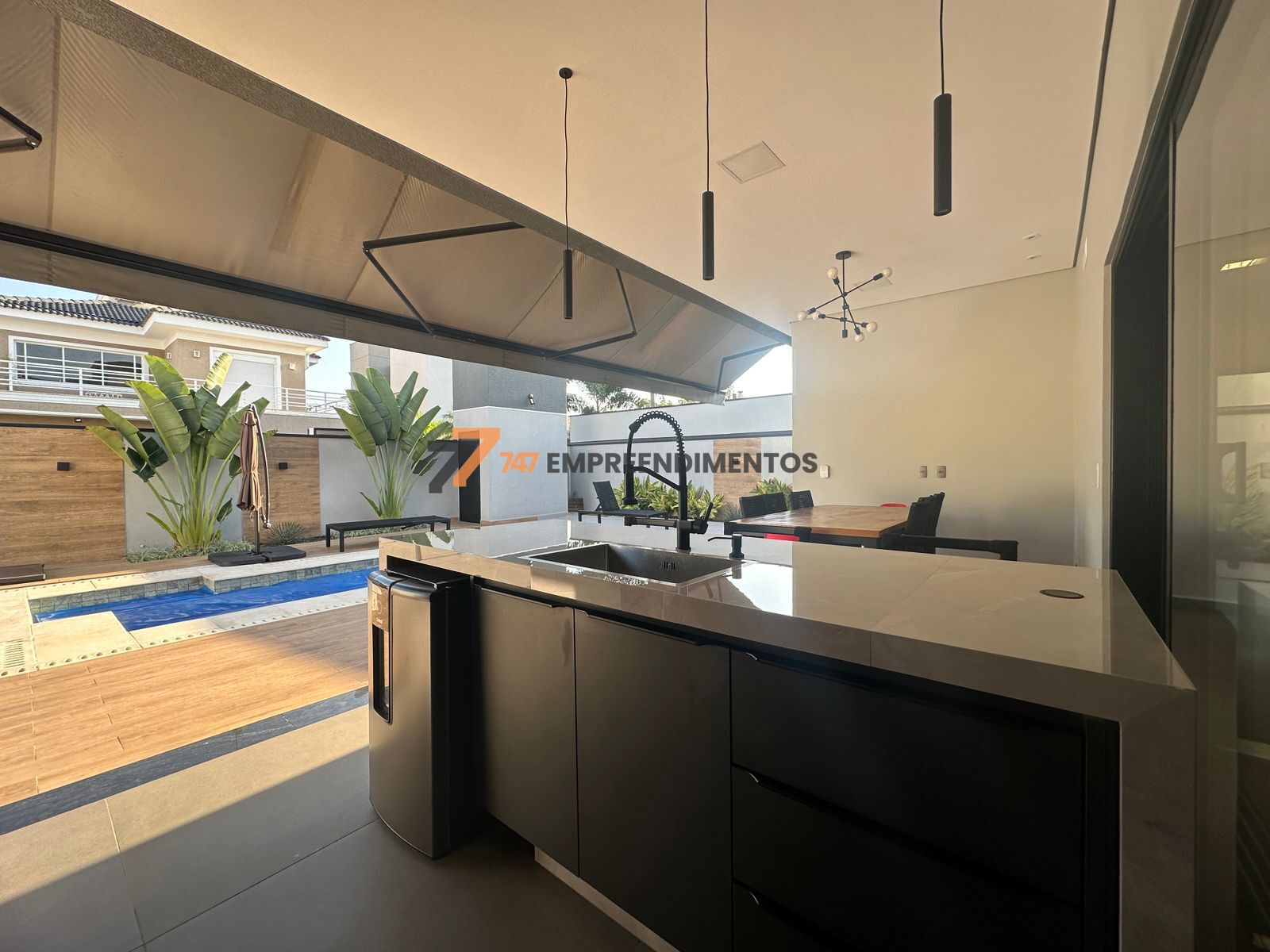 Churrasqueira completa, cooktop a gás, bancada com cuba profunda, mesa em madeira tratada e área externa projetada para o máximo conforto.
