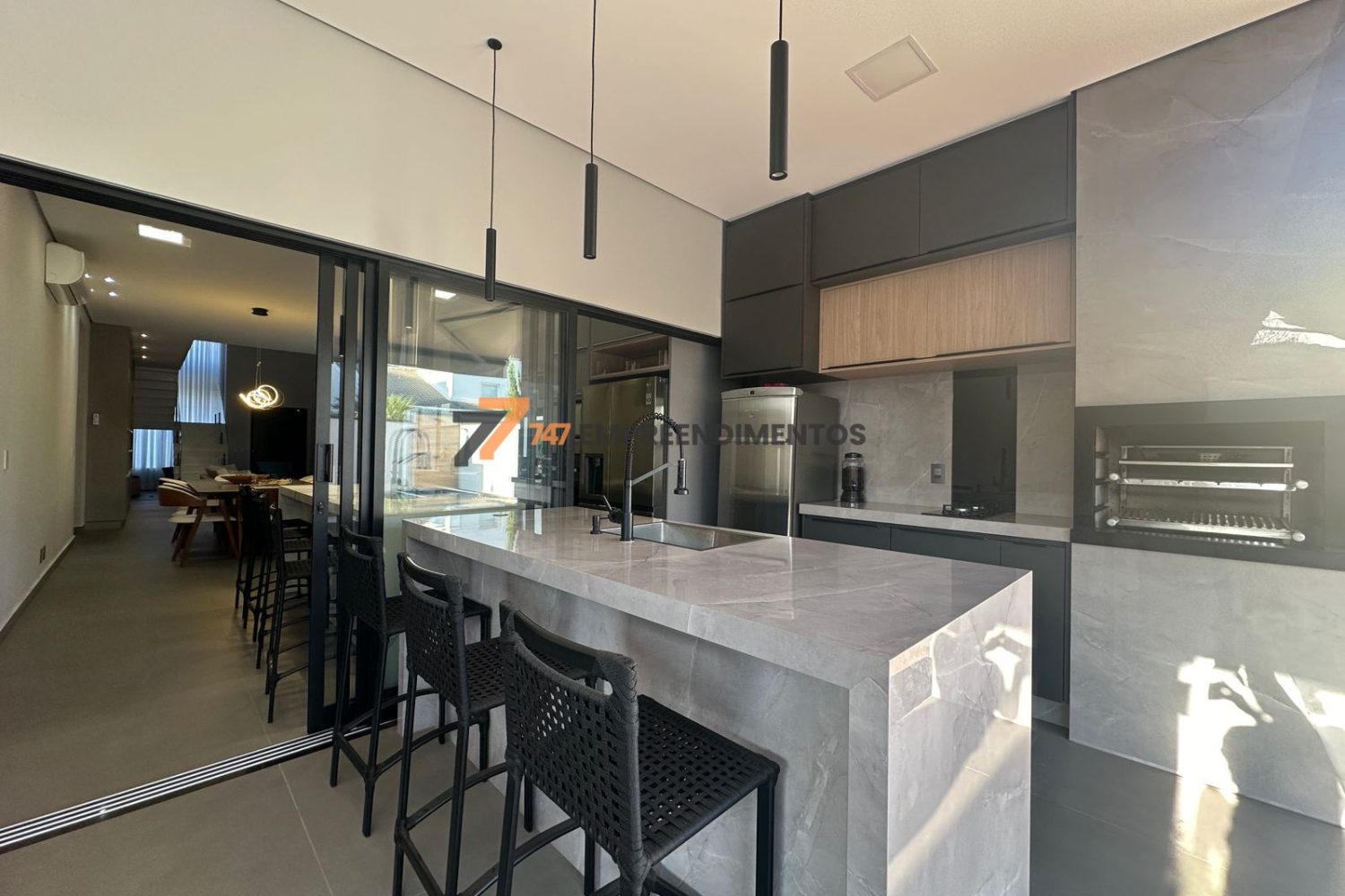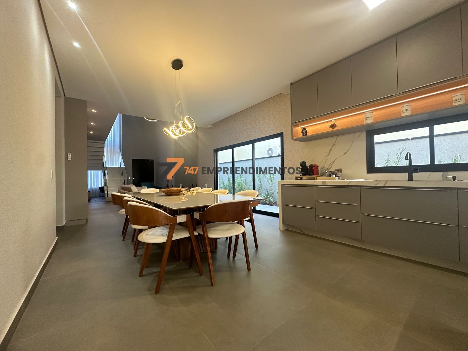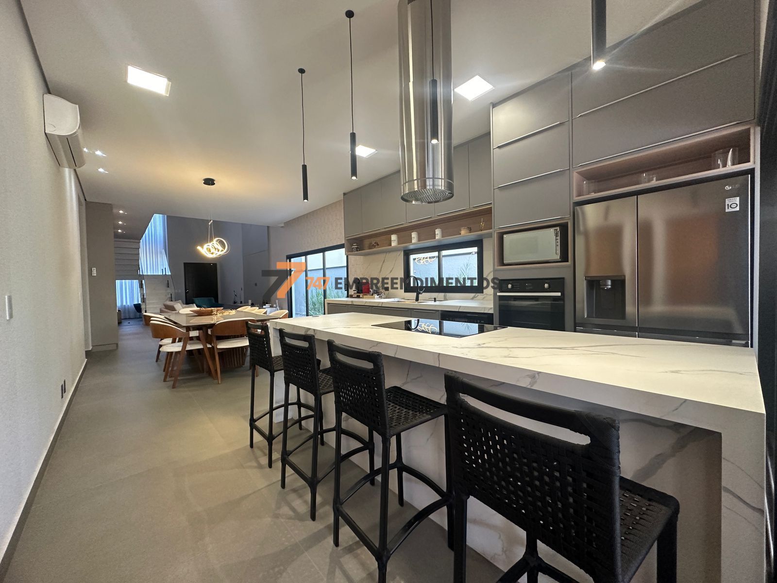 A casa foi planejada para reunir — sala de estar, jantar, cozinha e área gourmet se conectam em um único ambiente fluido e elegante, ideal para momentos com a família e amigos.