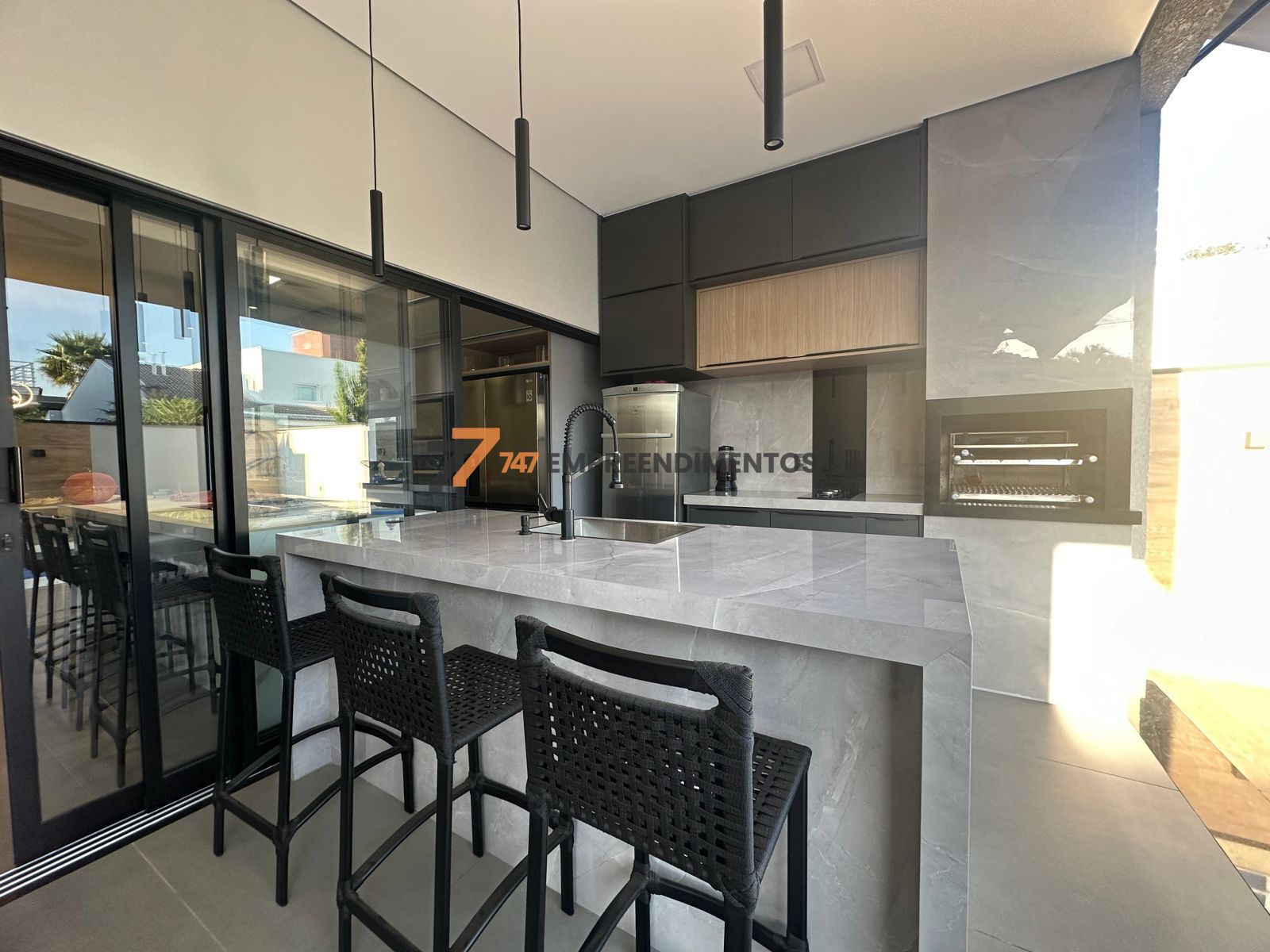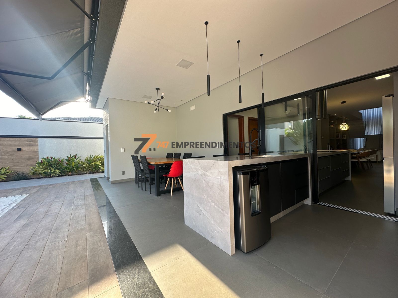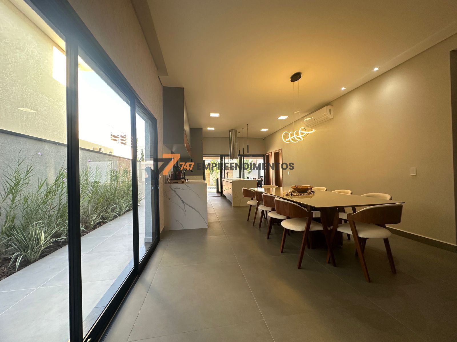 A casa foi planejada para reunir — sala de estar, jantar, cozinha e área gourmet se conectam em um único ambiente fluido e elegante, ideal para momentos com a família e amigos.