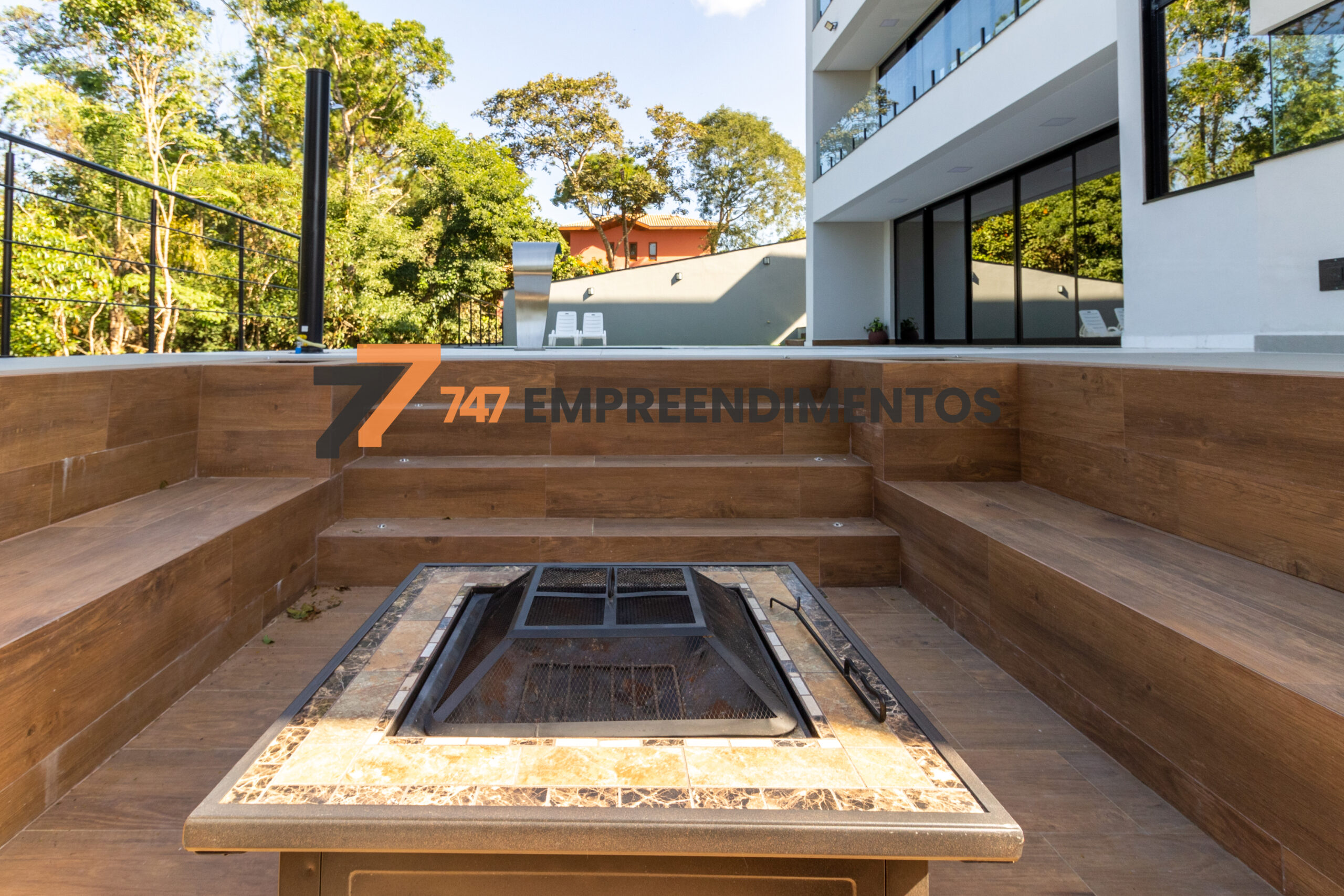 Na área externa, uma lareira ao ar livre convida para noites aconchegantes sob o céu estrelado.