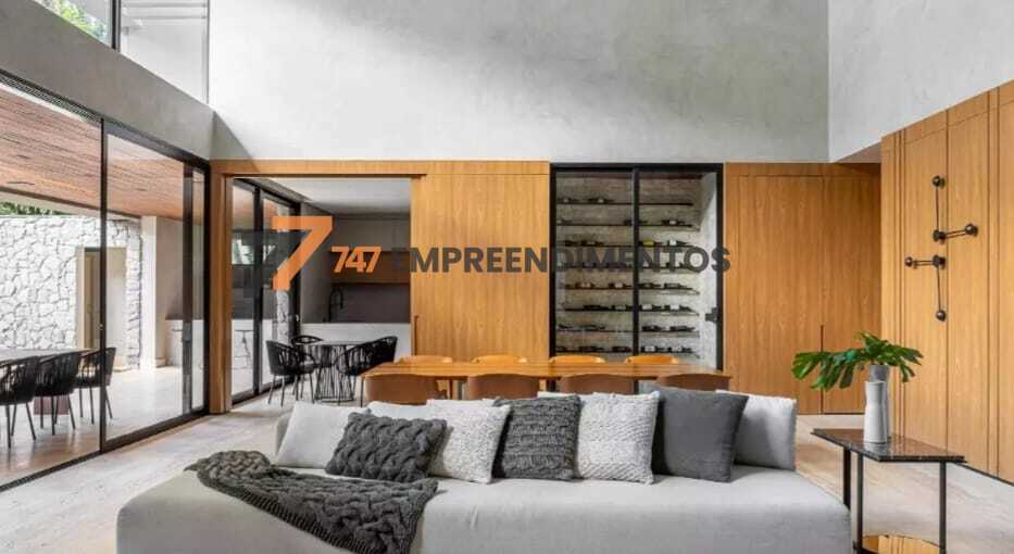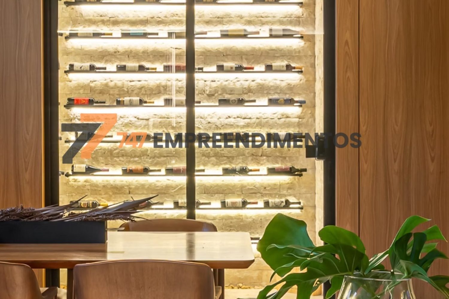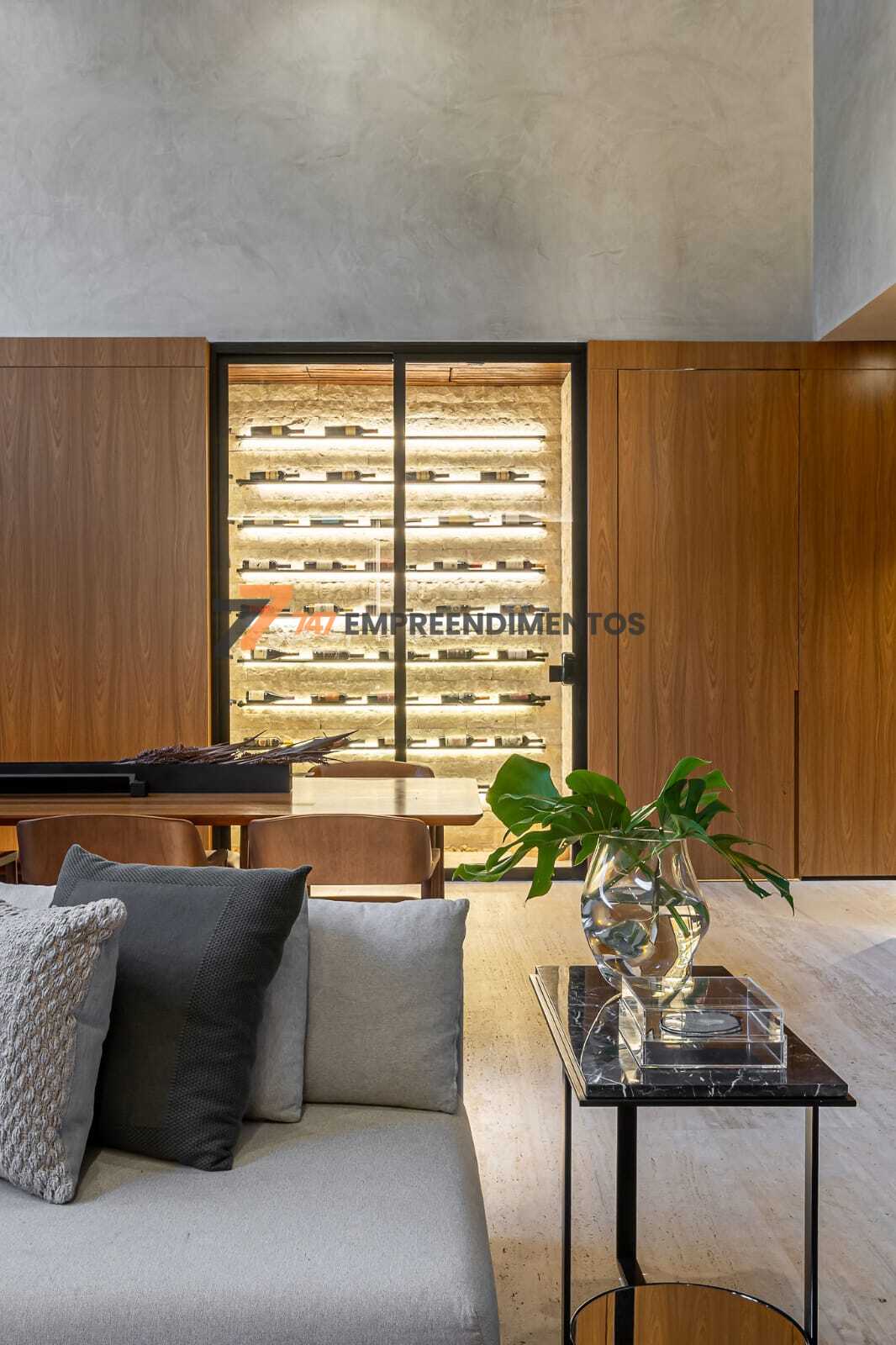 A sala principal, imponente e acolhedora, conecta-se à adega climatizada, ao lavabo decorado e à cozinha totalmente equipada, além de uma área gourmet perfeita para receber.
