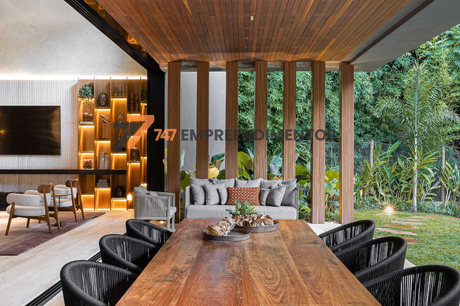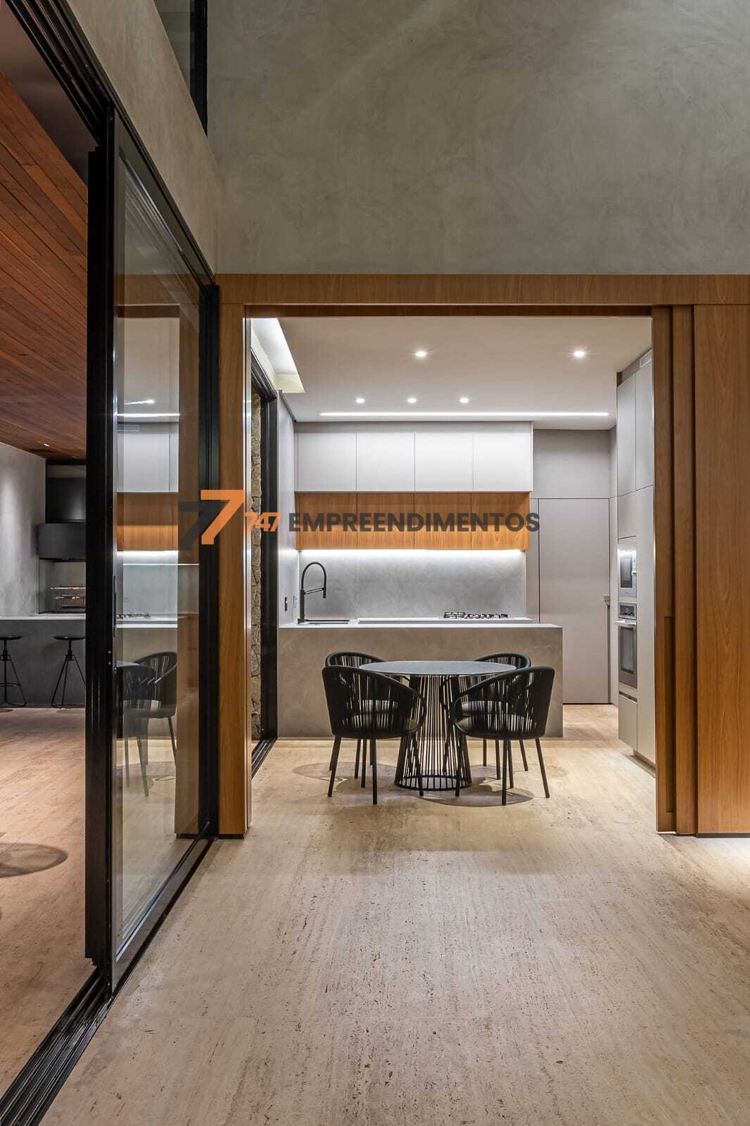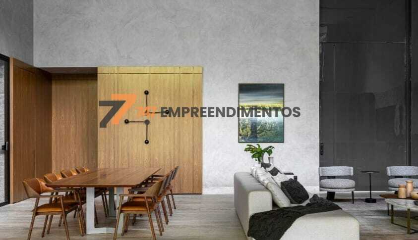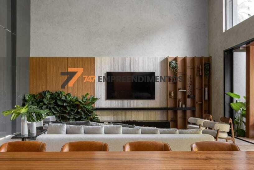 Com 600m² de área construída em um terreno de 3.400m², o projeto privilegia espaços amplos e bem integrados, com pé-direito duplo e ambientes banhados por luz natural.